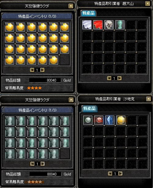 昨日お金がなくてギルメンに手伝ってもらい交易をしましたー!! 商人をしてくれる人がいたのでハンターをすることに・・・ 敦煌→和田 商人2人(☆5)、ハンター5人 NPC盗賊もmobも瞬殺でした^^; 和田→敦煌 商人2人(☆5)、ハンター2人 1回ラクダが死んだけど予備のラクダは餌を持ってれば何の問題なく成功できます 報酬をもらえるなら暇な時☆5手伝いますよー^^b |